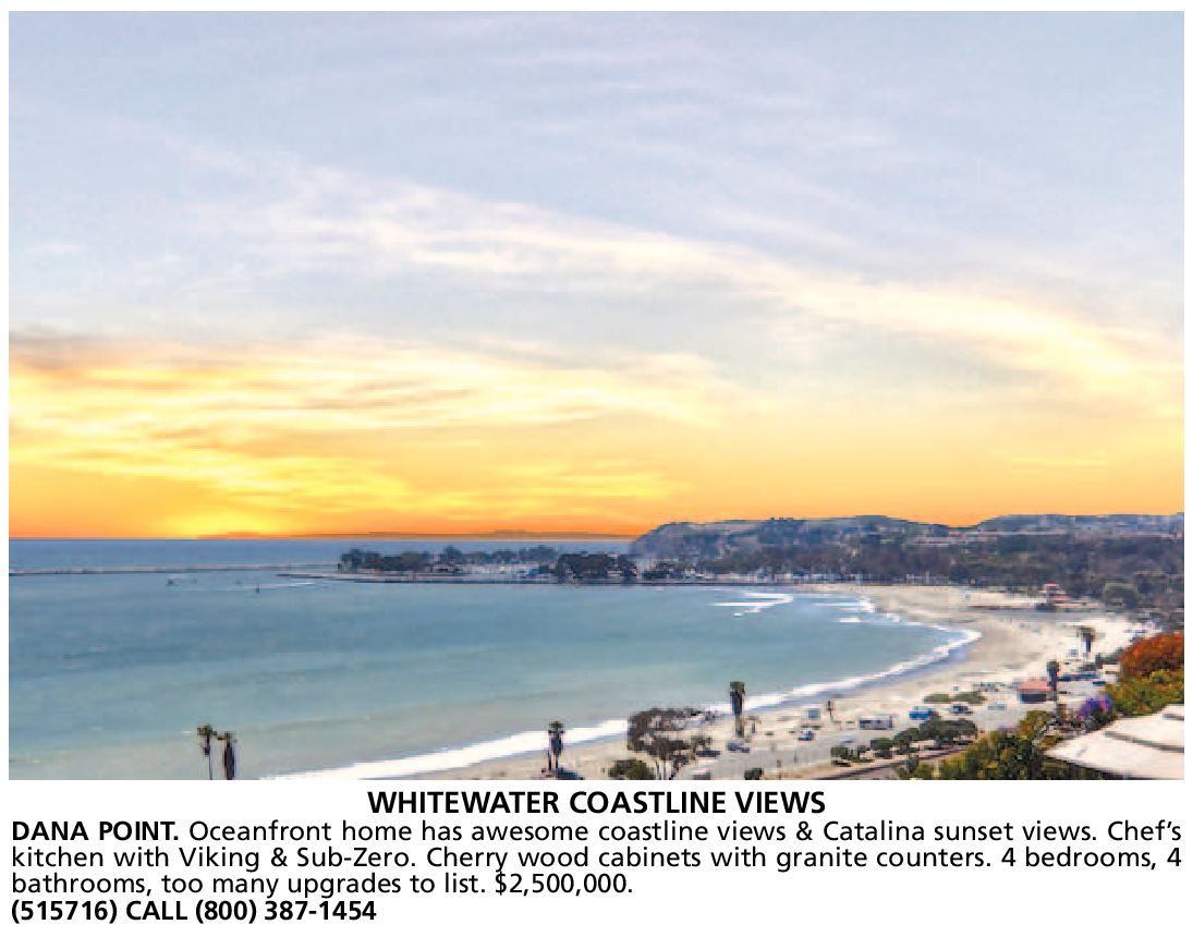 WHITEWATER COASTLINE VIEWS DANA POINT. Oceanfront home has awesome coastline views & Catalina sunset views. Chef’s kitchen with Viking & Sub-Zero. Cherry wood cabinets with granite counters. 4 bedrooms, 4 bathrooms, too many upgrades to list. $2,500,000. (515716) CALL (800) 387-1454