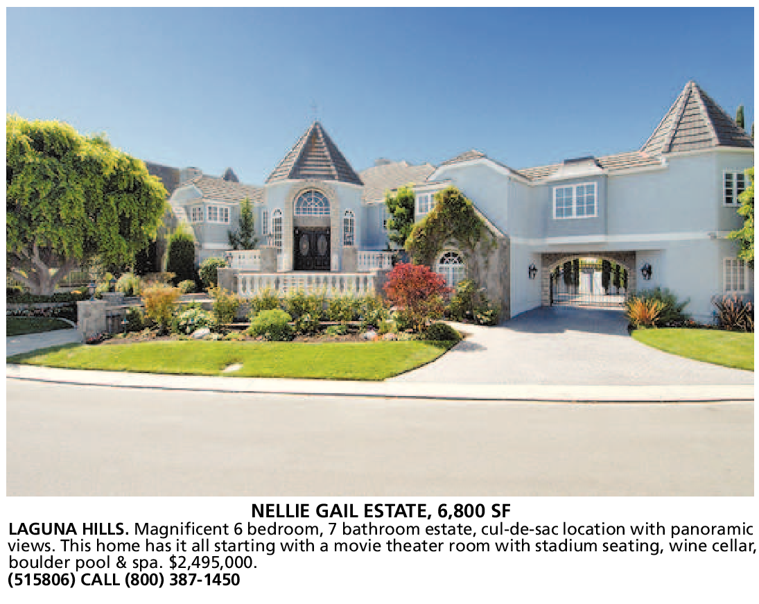 NELLIE GAIL ESTATE, 6,800 SF LAGUNA HILLS. Magnificent 6 bedroom, 7 bathroom estate, cul-de-sac location with panoramic views. This home has it all starting with a movie theater room with stadium seating, wine cellar, boulder pool & spa. $2,495,000. (515806) CALL (800) 387-1450