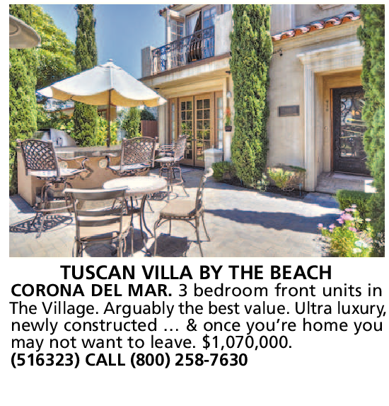 TUSCAN VILLA BY THE BEACH CORONA DEL MAR. 3 bedroom front units in The Village. Arguably the best value. Ultra luxury, newly constructed … & once you’re home you may not want to leave. $1,070,000. (516323) CALL (800) 258-7630