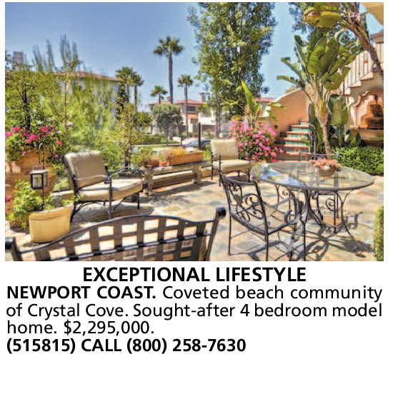 EXCEPTIONAL LIFESTYLE NEWPORT COAST. Coveted beach community of Crystal Cove. Sought-after 4 bedroom model home. $2,295,000. (515815) CALL (800) 258-7630