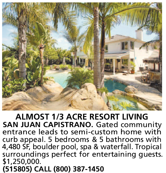 ALMOST 1/3 ACRE RESORT LIVING SAN JUAN CAPISTRANO. Gated community entrance leads to semi-custom home with curb appeal. 5 bedrooms & 5 bathrooms with 4,480 SF, boulder pool, spa & waterfall. Tropical surroundings perfect for entertaining guests. $1,250,000. (515805) CALL (800) 387-1450