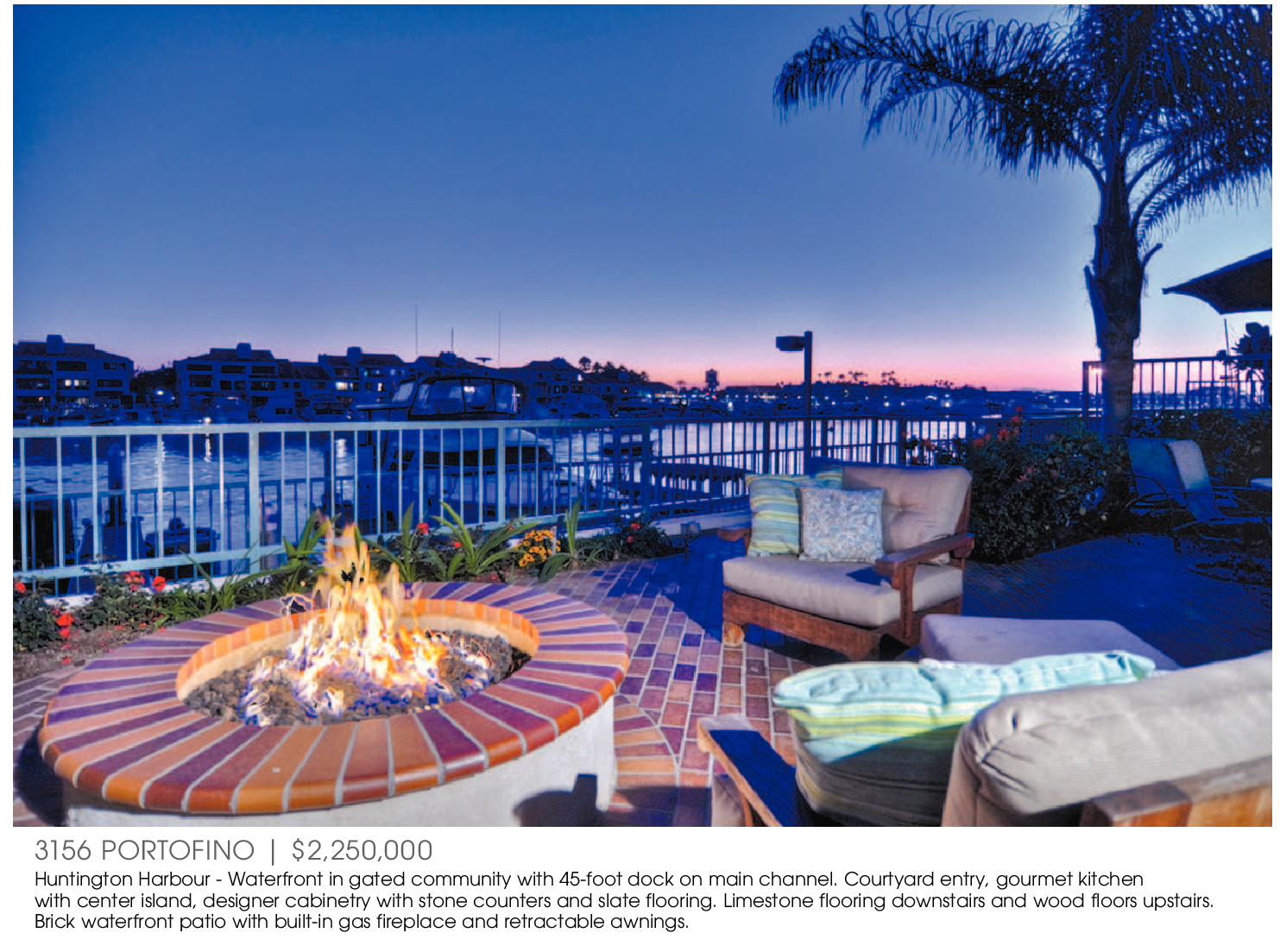3156 PORTOFINO | $2,250,000 Huntington Harbour - Waterfront in gated community with 45-foot dock on main channel. Courtyard entry, gourmet kitchen with center island, designer cabinetry with stone counters and slate flooring. Limestone flooring downstairs and wood floors upstairs. Brick waterfront patio with built-in gas fireplace and retractable awnings.