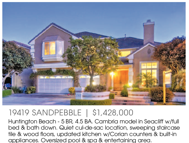19419 SANDPEBBLE | $1,428,000 Huntington Beach - 5 BR, 4.5 BA. Cambria model in Seacliff w/full bed & bath down. Quiet cul-de-sac location, sweeping staircase tile & wood floors, updated kitchen w/Corian counters & built-in appliances. Oversized pool & spa & entertaining area.