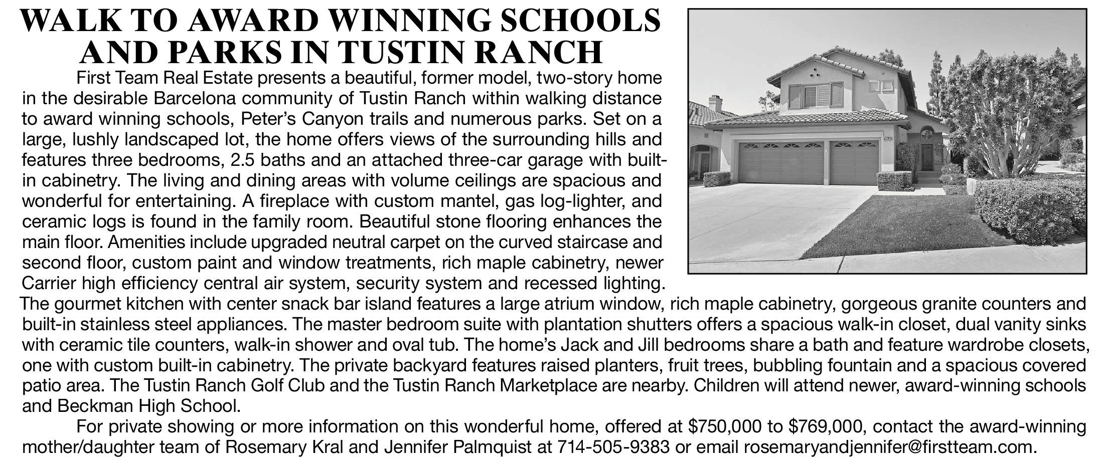 WALK TO AWARD WINNING SCHOOLS AND PARKS IN TUSTIN RANCH First Team Real Estate presents a beautiful, former model, two-story home in the desirable Barcelona community of Tustin Ranch within walking distance to award winning schools, Peter’s Canyon trails and numerous parks. Set on a large, lushly landscaped lot, the home offers views of the surrounding hills and features three bedrooms, 2.5 baths and an attached three-car garage with builtin cabinetry. The living and dining areas with volume ceilings are spacious and wonderful for entertaining. A ireplace with custom mantel, gas log-lighter, and ceramic logs is found in the family room. Beautiful stone looring enhances the main loor. Amenities include upgraded neutral carpet on the curved staircase and second loor, custom paint and window treatments, rich maple cabinetry, newer Carrier high eficiency central air system, security system and recessed lighting. The gourmet kitchen with center snack bar island features a large atrium window, rich maple cabinetry, gorgeous granite counters and built-in stainless steel appliances. The master bedroom suite with plantation shutters offers a spacious walk-in closet, dual vanity sinks with ceramic tile counters, walk-in shower and oval tub. The home’s Jack and Jill bedrooms share a bath and feature wardrobe closets, one with custom built-in cabinetry. The private backyard features raised planters, fruit trees, bubbling fountain and a spacious covered patio area. The Tustin Ranch Golf Club and the Tustin Ranch Marketplace are nearby. Children will attend newer, award-winning schools and Beckman High School. For private showing or more information on this wonderful home, offered at $750,000 to $769,000, contact the award-winning mother/daughter team of Rosemary Kral and Jennifer Palmquist at 714-505-9383 or email rosemaryandjennifer@i rstteam.com.