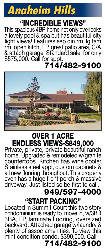 Anaheim Hills “INCREDIBLE VIEWS” This spacious 4BR home not only overlooks a lovely pool & spa but has beautiful city light views! Features sep din rm, lg fam rm, open kitch, FP, great patio area, C/A, & attach garage. Standard sale, for only $575,000. Call for appt. 714/482-9100 OVER 1 ACRE ENDLESS VIEWS-$849,000 Private, private, private beautiful ranch home. Upgraded & remodeled w/granite countertops. Kitchen has wine cooler. Stainless steel appl, custom cabinets & all new looring throughout. This property even has a huge front porch & massive driveway. Just listed so be irst to call. 949/597-4000 “START PACKING” Located In Summit Court this two story condominium is ready to move in, w/3BR, 3BA, FP, laminate l ooring, oversized backyard. Attached garage w/laundry & plenty of assoc amenities. To view this mint condition condo. $390,000. Call 714/482-9100