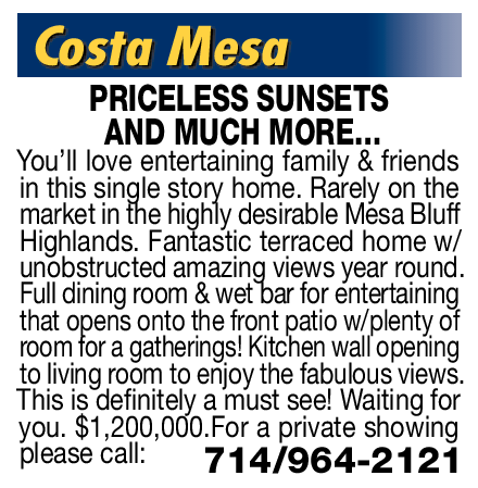 Costa Mesa PRICELESS SUNSETS AND MUCH MORE… You’ll love entertaining family & friends in this single story home. Rarely on the market in the highly desirable Mesa Bluff Highlands. Fantastic terraced home w/ unobstructed amazing views year round. Full dining room & wet bar for entertaining that opens onto the front patio w/plenty of room for a gatherings! Kitchen wall opening to living room to enjoy the fabulous views. This is dei nitely a must see! Waiting for you. $1,200,000.For a private showing please call: 714/964-2121