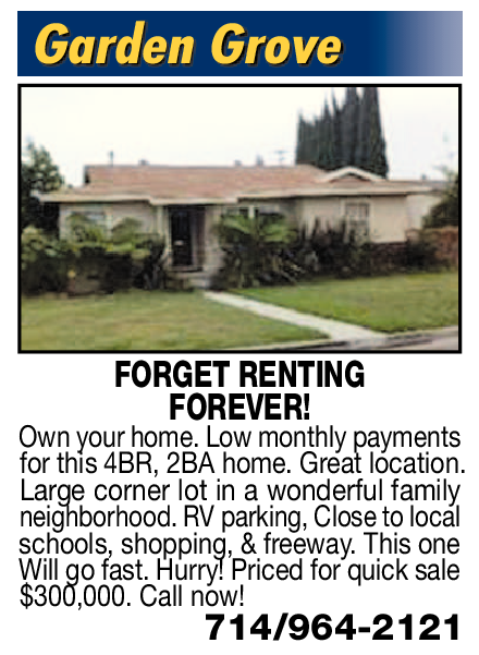 Garden Grove FORGET RENTING FOREVER! Own your home. Low monthly payments for this 4BR, 2BA home. Great location. Large corner lot in a wonderful family neighborhood. RV parking, Close to local schools, shopping, & freeway. This one Will go fast. Hurry! Priced for quick sale $300,000. Call now! 714/964-2121