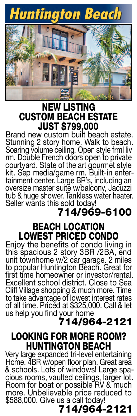 Huntington Beach NEW LISTING CUSTOM BEACH ESTATE JUST $799,000 Brand new custom built beach estate. Stunning 2 story home. Walk to beach. Soaring volume ceiling. Open style frml liv rm. Double French doors open to private courtyard. State of the art gourmet style kit. Sep media/game rm. Built-in entertainment center. Large BR’s, including an oversize master suite w/balcony, Jacuzzi tub & huge shower. Tankless water heater. Seller wants this sold today! 714/969-6100 BEACH LOCATION LOWEST PRICED CONDO Enjoy the beneits of condo living in this spacious 2 story 3BR /2BA, end unit townhome w/2 car garage. 2 miles to popular Huntington Beach. Great for irst time homeowner or investor/rental. Excellent school district. Close to Sea Cliff Village shopping & much more. Time to take advantage of lowest interest rates of all time. Priced at $325,000. Call & let us help you ind your home 714/964-2121 LOOKING FOR MORE ROOM? HUNTINGTON BEACH Very large expanded tri-level entertaining Home. 4BR w/open loor plan. Great area & schools. Lots of windows! Large spacious rooms, vaulted ceilings, larger lot. Room for boat or possible RV & much more. Unbelievable price reduced to $588,000. Give us a call today! 714/964-2121 See also