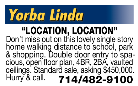 Yorba Linda “LOCATION, LOCATION” Don’t miss out on this lovely single story home walking distance to school, park & shopping. Double door entry to spacious, open loor plan, 4BR, 2BA, vaulted ceilings. Standard sale, asking $450,000. Hurry & call. 714/482-9100