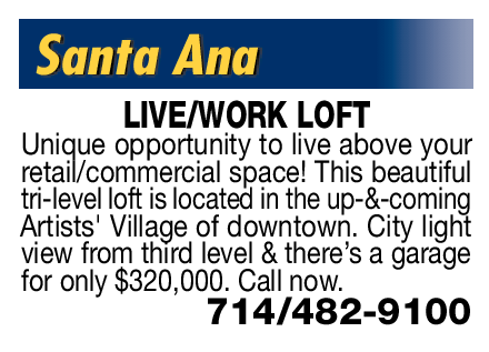 Santa Ana LIVE/WORK LOFT Unique opportunity to live above your retail/commercial space! This beautiful tri-level loft is located in the up-&-coming Artists' Village of downtown. City light view from third level & there’s a garage for only $320,000. Call now. 714/482-9100