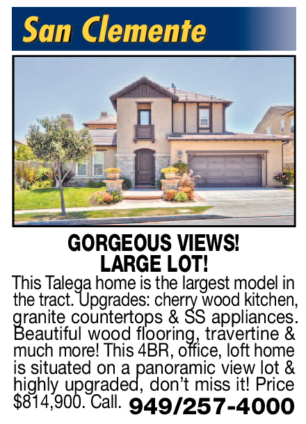 San Clemente GORGEOUS VIEWS! LARGE LOT! This Talega home is the largest model in the tract. Upgrades: cherry wood kitchen, granite countertops & SS appliances. Beautiful wood l ooring, travertine & much more! This 4BR, ofi ce, loft home is situated on a panoramic view lot & highly upgraded, don’t miss it! Price $814,900. Call. 949/257-4000