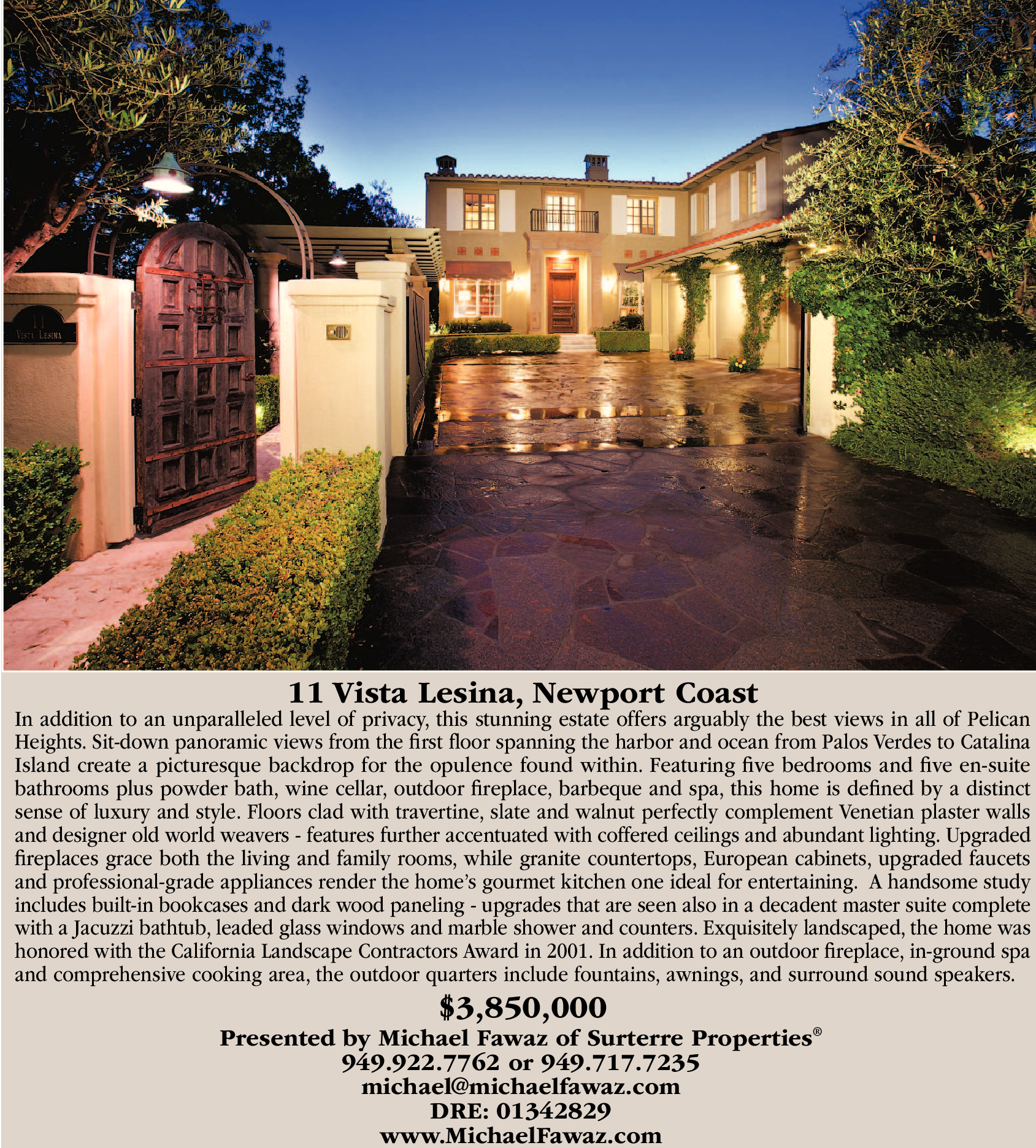 11 Vista Lesina, Newport Coast In addition to an unparalleled level of privacy, this stunning estate offers arguably the best views in all of Pelican Heights. Sit-down panoramic views from the fi rst floor spanning the harbor and ocean from Palos Verdes to Catalina Island create a picturesque backdrop for the opulence found within. Featuring five bedrooms and fi ve en-suite bathrooms plus powder bath, wine cellar, outdoor fireplace, barbeque and spa, this home is defined by a distinct sense of luxury and style. Floors clad with travertine, slate and walnut perfectly complement Venetian plaster walls and designer old world weavers - features further accentuated with coffered ceilings and abundant lighting. Upgraded fireplaces grace both the living and family rooms, while granite countertops, European cabinets, upgraded faucets and professional-grade appliances render the home’s gourmet kitchen one ideal for entertaining. A handsome study includes built-in bookcases and dark wood paneling - upgrades that are seen also in a decadent master suite complete with a Jacuzzi bathtub, leaded glass windows and marble shower and counters. Exquisitely landscaped, the home was honored with the California Landscape Contractors Award in 2001. In addition to an outdoor fireplace, in-ground spa and comprehensive cooking area, the outdoor quarters include fountains, awnings, and surround sound speakers. $3,850,000 Presented by Michael Fawaz of Surterre Properties ® 949.922.7762 or 949.717.7235 michael@michaelfawaz.com DRE: 01342829 www.MichaelFawaz.com