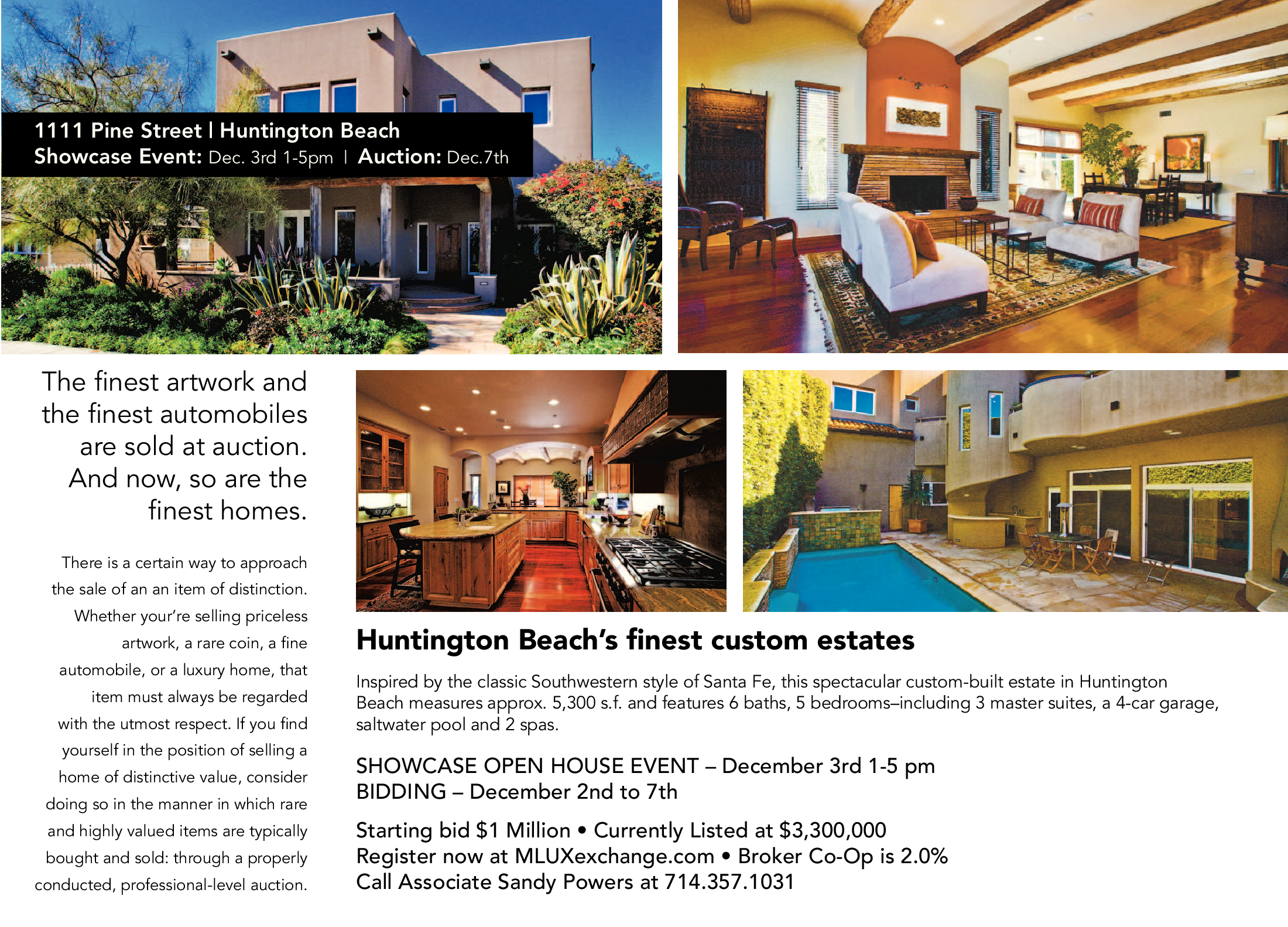 1111 Pine Street | Huntington Beach Showcase Event: Dec. 3rd 1-5pm | Auction: Dec.7th The finest artwork and the finest automobiles are sold at auction. And now, so are the finest homes. There is a certain way to approach the sale of an an item of distinction. Whether your’re selling priceless artwork, a rare coin, a fine automobile, or a luxury home, that item must always be regarded with the utmost respect. If you find yourself in the position of selling a home of distinctive value, consider doing so in the manner in which rare and highly valued items are typically bought and sold: through a properly conducted, professional-level auction. Huntington Beach’s finest custom estates Inspired by the classic Southwestern style of Santa Fe, this spectacular custom-built estate in Huntington Beach measures approx. 5,300 s.f. and features 6 baths, 5 bedrooms–including 3 master suites, a 4-car garage, saltwater pool and 2 spas. SHOWCASE OPEN HOUSE EVENT – December 3rd 1-5 pm BIDDING – December 2nd to 7th Starting bid $1 Million • Currently Listed at $3,300,000 Register now at MLUXexchange.com • Broker Co-Op is 2.0% Call Associate Sandy Powers at 714.357.1031