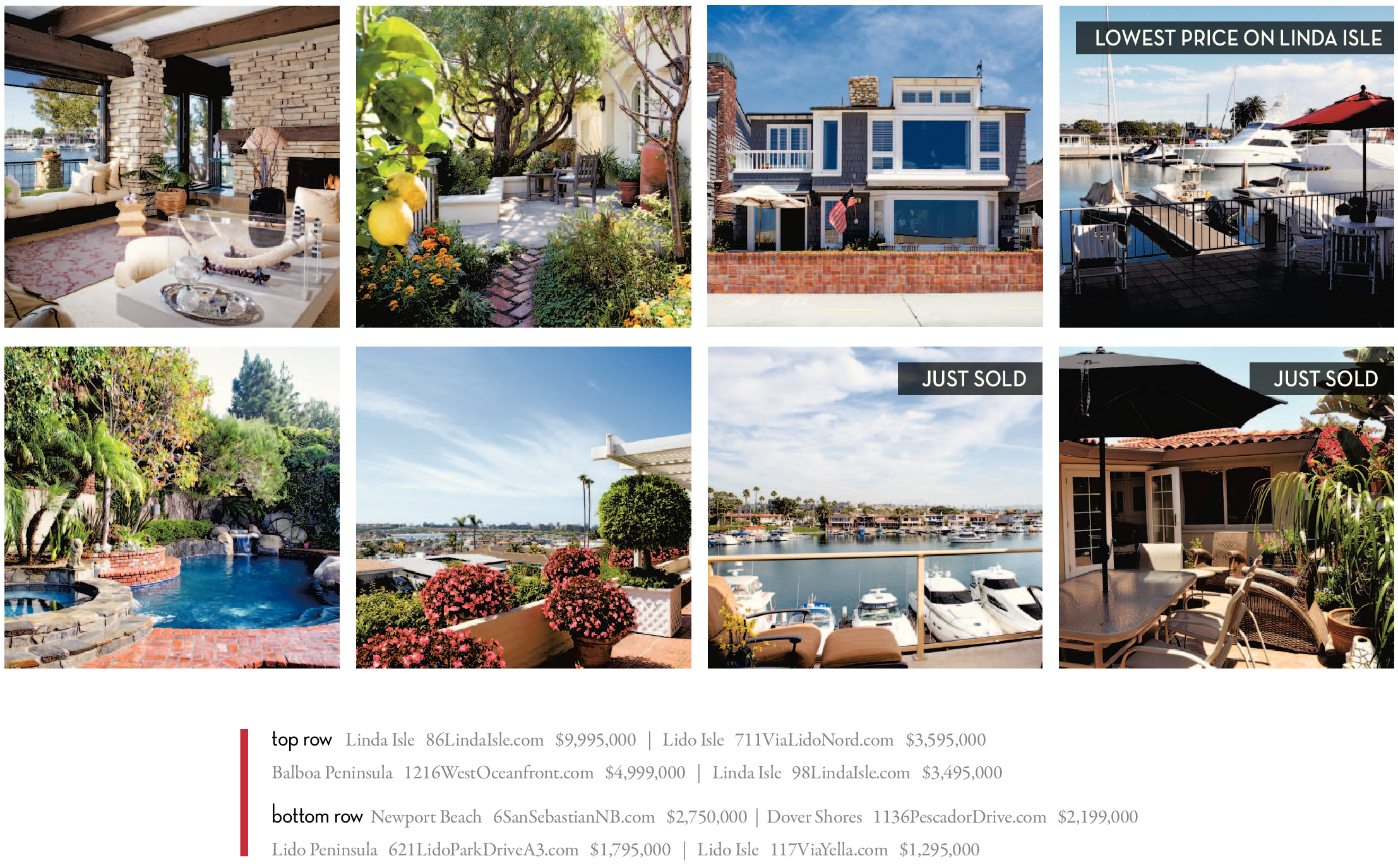 LOWEST PRICE ON LINDA ISLE JUST SOLD JUST SOLD top row Linda Isle 86LindaIsle.com $9,995,000 | Lido Isle 711ViaLidoNord.com $3,595,000 Balboa Peninsula 1216WestOceanfront.com $4,999,000 | Linda Isle 98LindaIsle.com $3,495,000 bottom row Newport Beach 6SanSebastianNB.com $2,750,000 | Dover Shores 1136PescadorDrive.com $2,199,000 Lido Peninsula 621LidoParkDriveA3.com $1,795,000 | Lido Isle 117ViaYella.com $1,295,000
