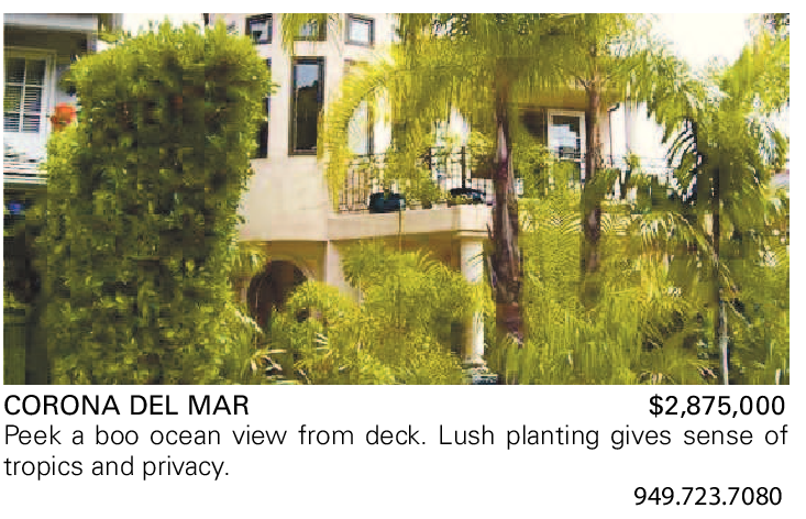 CORONA DEL MAR $2,875,000 Peek a boo ocean view from deck. Lush planting gives sense of tropics and privacy.