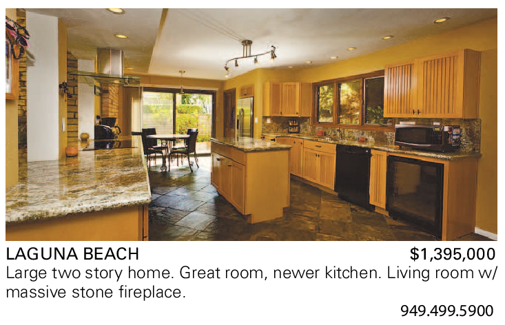 LAGUNA BEACH $1,395,000 Large two story home. Great room, newer kitchen. Living room w/ massive stone fireplace.
