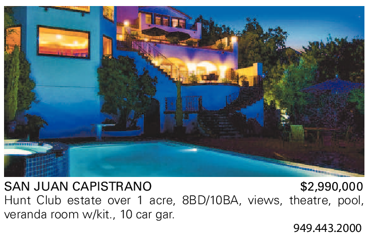 SAN JUAN CAPISTRANO $2,990,000 Hunt Club estate over 1 acre, 8BD/10BA, views, theatre, pool, veranda room w/kit., 10 car gar.