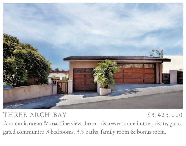 THREE ARCH BAY $3,425,000 Panoramic ocean & coastline views from this newer home in the private, guard gated community. 3 bedrooms, 3.5 baths, family room & bonus room.