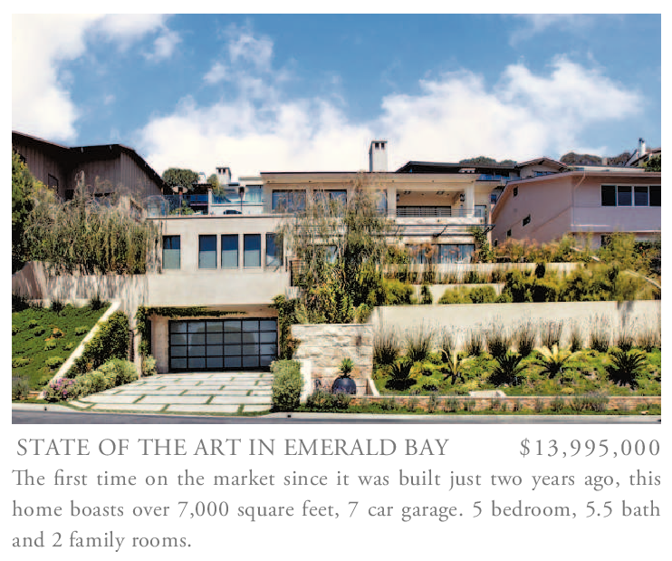 STATE OF THE ART IN EMERALD BAY $13,995,000 he irst time on the market since it was built just two years ago, this home boasts over 7,000 square feet, 7 car garage. 5 bedroom, 5.5 bath and 2 family rooms.