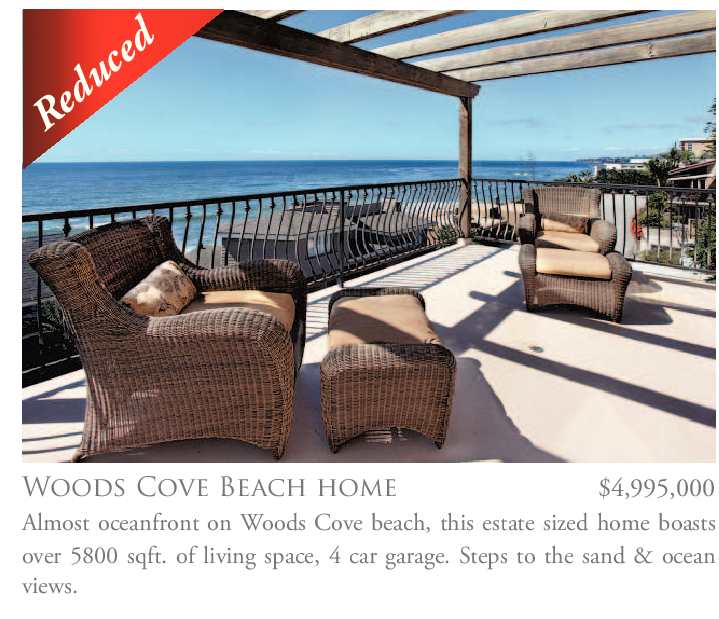 Woods Cove Beach home $4,995,000 Almost oceanfront on Woods Cove beach, this estate sized home boasts over 5800 sqft. of living space, 4 car garage. Steps to the sand & ocean views.