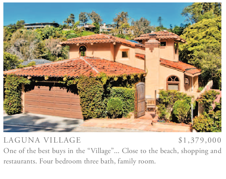 LAGUNA VILLAGE $1,379,000 One of the best buys in the “Village”... Close to the beach, shopping and restaurants. Four bedroom three bath, family room.