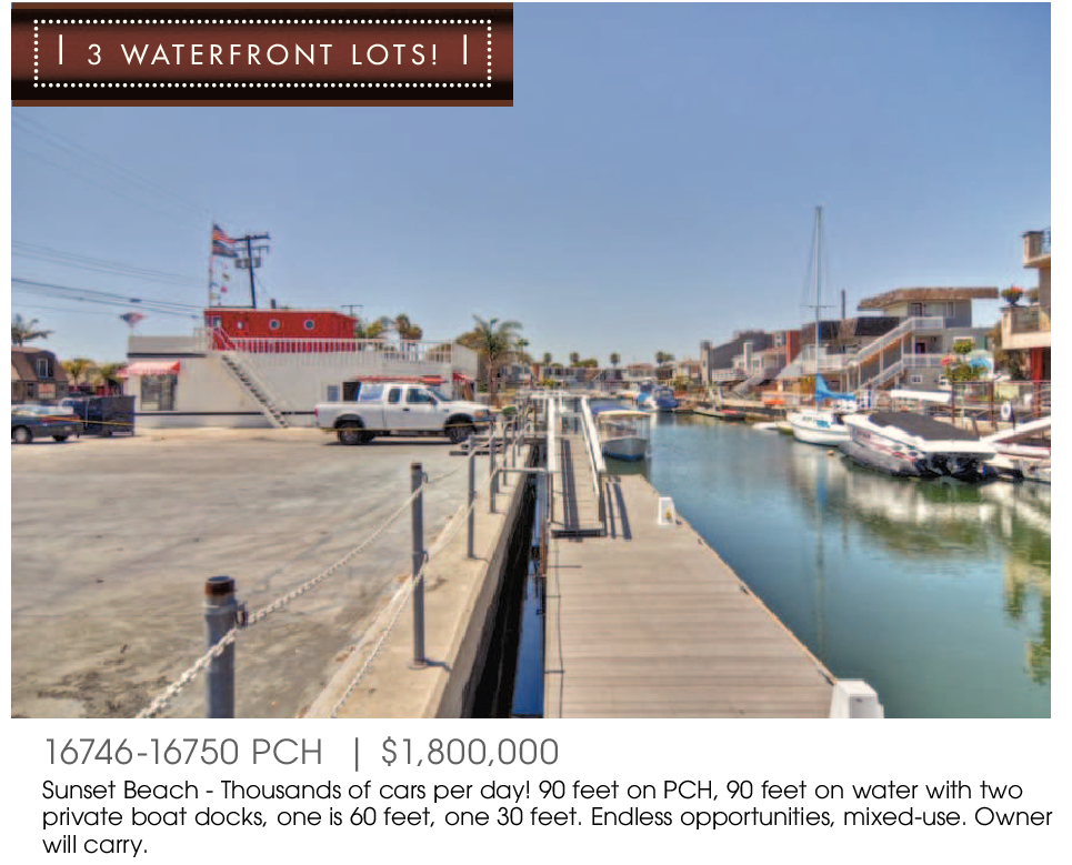 Sunset Beach - Thousands of cars per day! 90 feet on PCH, 90 feet on water with two private boat docks, one is 60 feet, one 30 feet. Endless opportunities, mixed-use. Owner will carry.