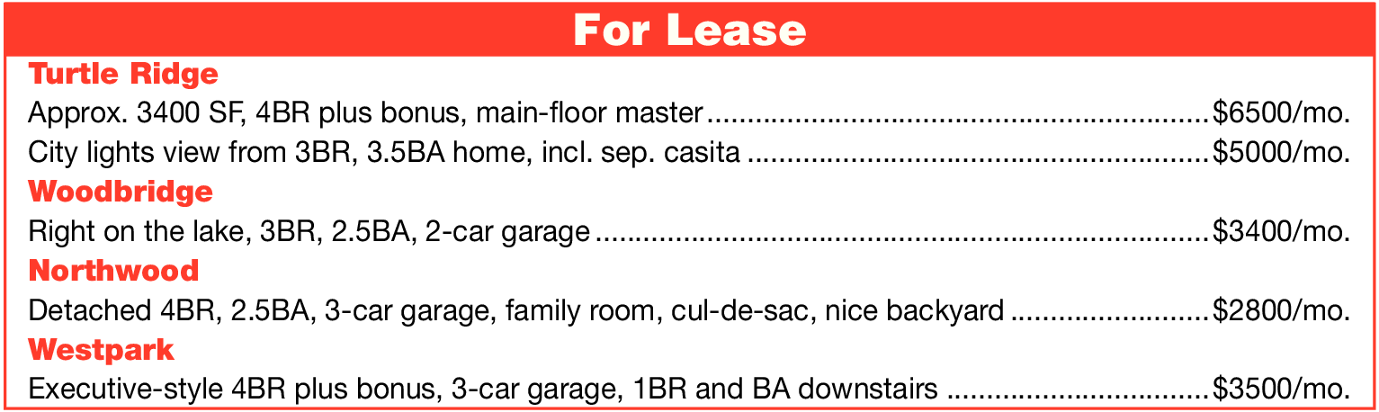 For Lease Turtle Ridge Approx. 3400 SF, 4BR plus bonus, main-l oor master ...............................................................$6500/mo. City lights view from 3BR, 3.5BA home, incl. sep. casita ..........................................................$5000/mo. Woodbridge Right on the lake, 3BR, 2.5BA, 2-car garage .............................................................................$3400/mo. Northwood Detached 4BR, 2.5BA, 3-car garage, family room, cul-de-sac, nice backyard .........................$2800/mo. Westpark Executive-style 4BR plus bonus, 3-car garage, 1BR and BA downstairs .................................$3500/mo.