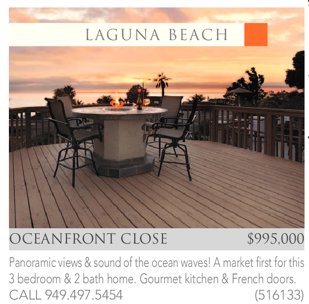 Panoramic views & sound of the ocean waves! A market first for this 3 bedroom & 2 bath home. Gourmet kitchen & French doors. CALL 949.497.5454 (516133)