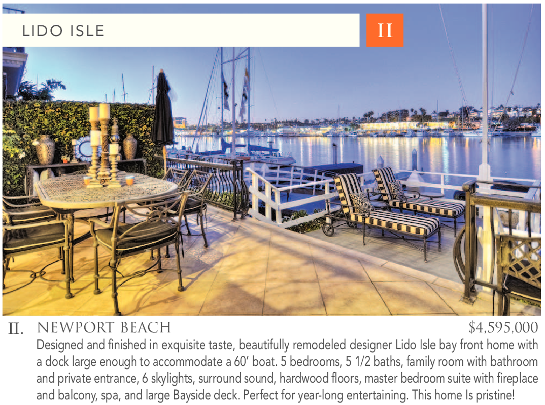 LIDO ISLE II II. NEWPORT BEACH $4,595,000 Designed and finished in exquisite taste, beautifully remodeled designer Lido Isle bay front home with a dock large enough to accommodate a 60’ boat. 5 bedrooms, 5 1/2 baths, family room with bathroom and private entrance, 6 skylights, surround sound, hardwood floors, master bedroom suite with fi replace and balcony, spa, and large Bayside deck. Perfect for year-long entertaining. This home Is pristine!