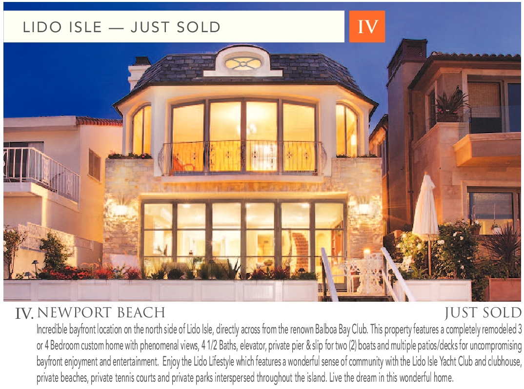 IV. NEWPORT BEACH JUST SOLD Incredible bayfront location on the north side of Lido Isle, directly across from the renown Balboa Bay Club. This property features a completely remodeled 3 or 4 Bedroom custom home with phenomenal views, 4 1/2 Baths, elevator, private pier & slip for two (2) boats and multiple patios/decks for uncompromising bayfront enjoyment and entertainment. Enjoy the Lido Lifestyle which features a wonderful sense of community with the Lido Isle Yacht Club and clubhouse, private beaches, private tennis courts and private parks interspersed throughout the island. Live the dream in this wonderful home.