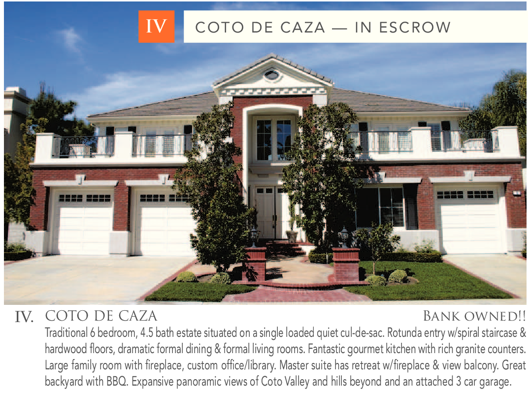 Traditional 6 bedroom, 4.5 bath estate situated on a single loaded quiet cul-de-sac. Rotunda entry w/spiral staircase & hardwood floors, dramatic formal dining & formal living rooms. Fantastic gourmet kitchen with rich granite counters. Large family room with fireplace, custom office/library. Master suite has retreat w/fireplace & view balcony. Great backyard with BBQ. Expansive panoramic views of Coto Valley and hills beyond and an attached 3 car garage.