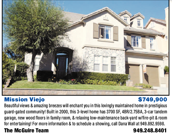 Mission Viejo $749,900 Beautiful views & amazing breezes will enchant you in this lovingly maintained home in prestigious guard-gated community! Built in 2000, this 3-level home has 3700 SF, 4BR/2.75BA, 3-car tandem garage, new wood floors in family room, & relaxing low-maintenance back-yard w/fire-pit & room for entertaining! For more information & to schedule a showing, call Dana Wall at 949.892.9598. The McGuire Team 949.248.8401