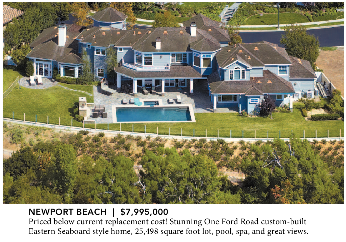 NEWPORT BEACH | $7,995,000 Priced below current replacement cost! Stunning One Ford Road custom-built Eastern Seaboard style home, 25,498 square foot lot, pool, spa, and great views.