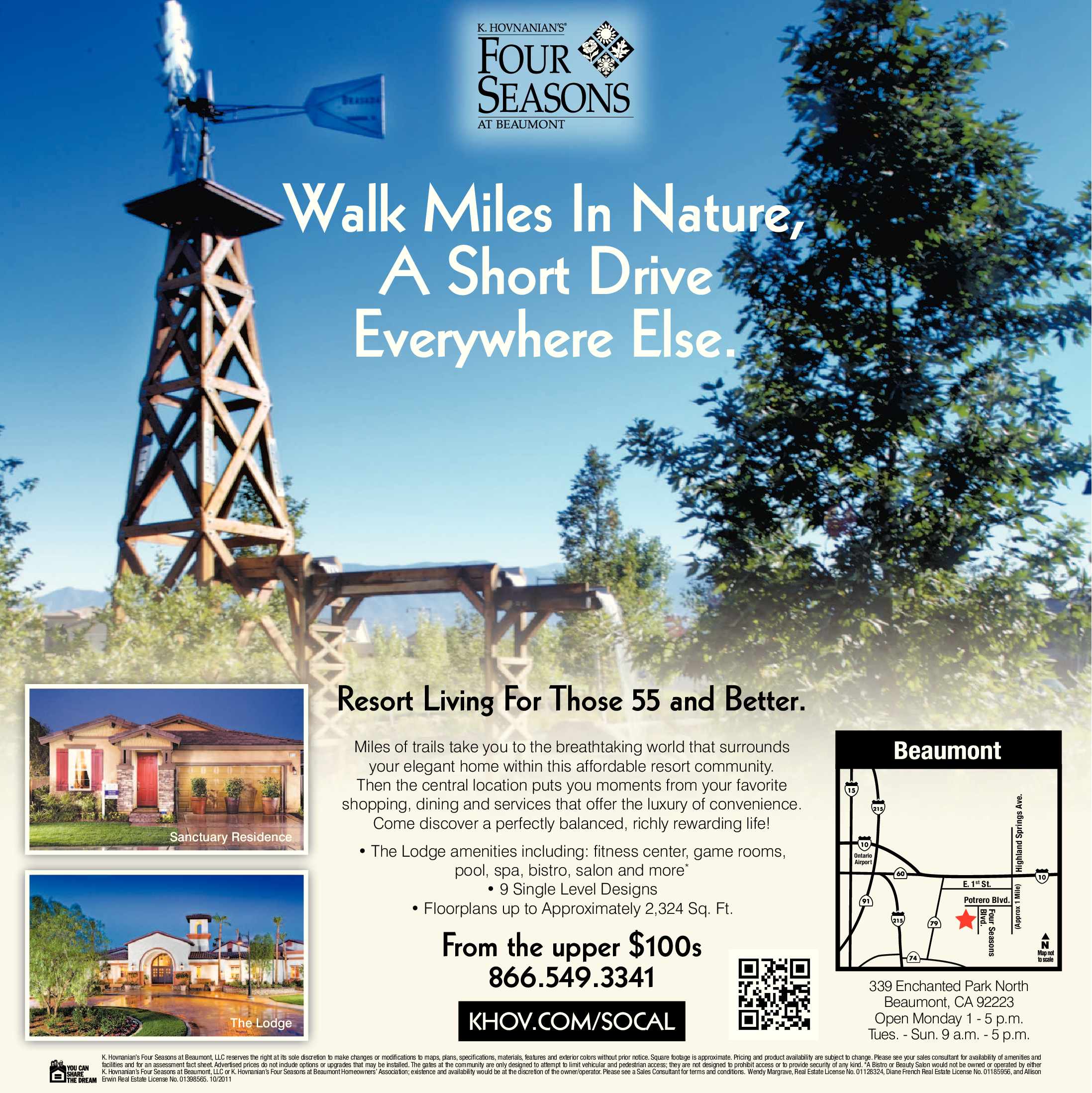 Walk Miles In Nature, A Short Drive Everywhere Else. Sanctuary Residence The Lodge Resort Living For Those 55 and Better. Miles of trails take you to the breathtaking world that surrounds your elegant home within this affordable resort community. Then the central location puts you moments from your favorite shopping, dining and services that offer the luxury of convenience. Come discover a perfectly balanced, richly rewarding life! • The Lodge amenities including: fitness center, game rooms, pool, spa, bistro, salon and more * • 9 Single Level Designs • Floorplans up to Approximately 2,324 Sq. Ft. From the upper $100s 866.549.3341 KHOV.COM/SOCAL Ontario Airport E. 1 st St. Potrero Blvd. 339 Enchanted Park North Beaumont, CA 92223 Open Monday 1 - 5 p.m. Tues. - Sun. 9 a.m. - 5 p.m. K. Hovnanian’s Four Seasons at Beaumont, LLC reserves the right at its sole discretion to make changes or modifications to maps, plans, specifications, materials, features and exterior colors without prior notice. Square footage is approximate. Pricing and product availability are subject to change. Please see your sales consultant for availability of amenities and facilities and for an assessment fact sheet. Advertised prices do not include options or upgrades that may be installed. The gates at the community are only designed to attempt to limit vehicular and pedestrian access; they are not designed to prohibit access or to provide security of any kind. *A Bistro or Beauty Salon would not be owned or operated by either K. Hovnanian’s Four Seasons at Beaumont, LLC or K. Hovnanian’s Four Seasons at Beaumont Homeowners’ Association; existence and availability would be at the discretion of the owner/operator. Please see a Sales Consultant for terms and conditions. Wendy Margrave, Real Estate License No. 01128324, Diane French Real Estate License No. 01185956, and Allison Erwin Real Estate License No. 01398565. 10/2011