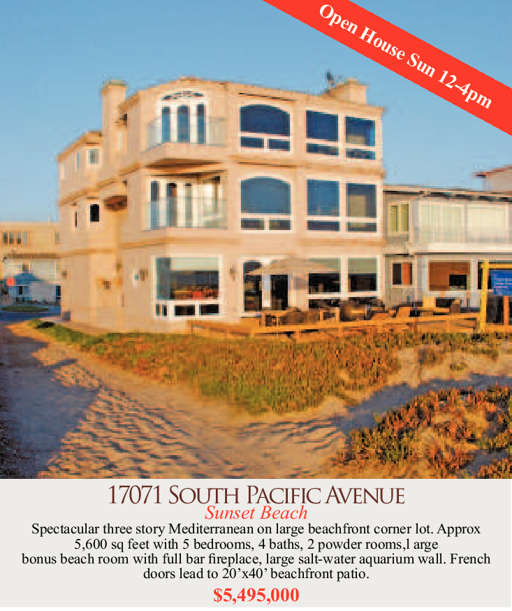 17071 South Pacific Avenue Sunset Beach Spectacular three story Mediterranean on large beachfront corner lot. Approx 5,600 sq feet with 5 bedrooms, 4 baths, 2 powder rooms,l arge bonusbeachroomwithfullbarfireplace,largesalt-wateraquariumwall.French doors lead to 20’x40’ beachfront patio. $5,495,000