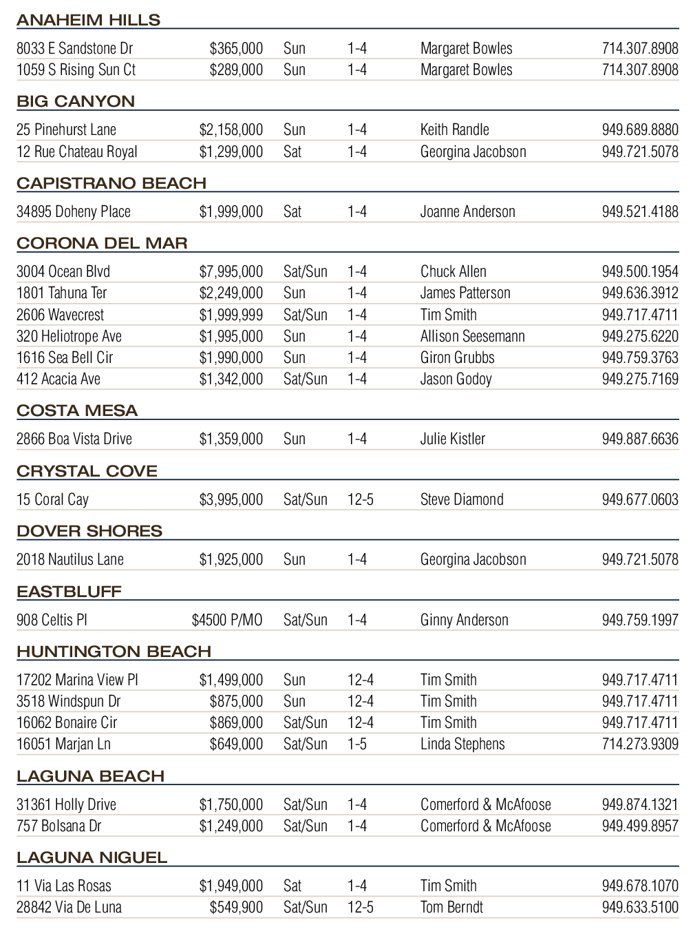 3004 Ocean Blvd $7,995,000 Sat/Sun 1-4 Chuck Allen 949.500.1954 1801 Tahuna Ter $2,249,000 Sun 1-4 James Patterson 949.636.3912 2606 Wavecrest $1,999,999 Sat/Sun 1-4 Tim Smith 949.717.4711 320 Heliotrope Ave $1,995,000 Sun 1-4 Allison Seesemann 949.275.6220 1616 Sea Bell Cir $1,990,000 Sun 1-4 Giron Grubbs 949.759.3763 412 Acacia Ave $1,342,000 Sat/Sun 1-4 Jason Godoy 949.275.7169