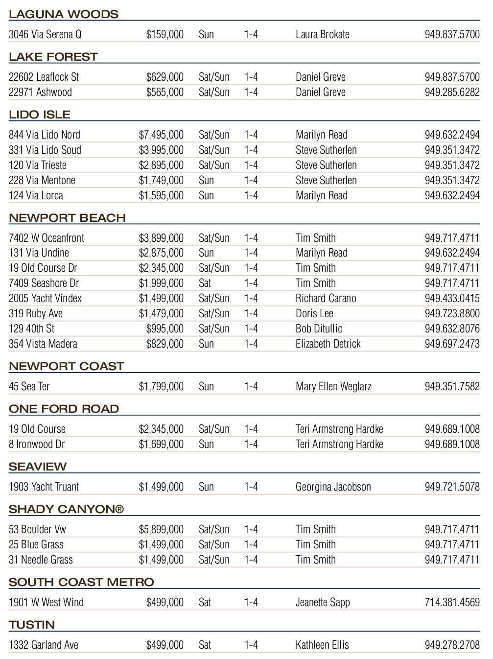 7402 W Oceanfront $3,899,000 Sat/Sun 1-4 Tim Smith 949.717.4711 131 Via Undine $2,875,000 Sun 1-4 Marilyn Read 949.632.2494 19 Old Course Dr $2,345,000 Sat/Sun 1-4 Tim Smith 949.717.4711 7409 Seashore Dr $1,999,000 Sat 1-4 Tim Smith 949.717.4711 2005 Yacht Vindex $1,499,000 Sat/Sun 1-4 Richard Carano 949.433.0415 319 Ruby Ave $1,479,000 Sat/Sun 1-4 Doris Lee 949.723.8800 129 40th St $995,000 Sat/Sun 1-4 Bob Ditullio 949.632.8076 354 Vista Madera $829,000 Sun 1-4 Elizabeth Detrick 949.697.2473