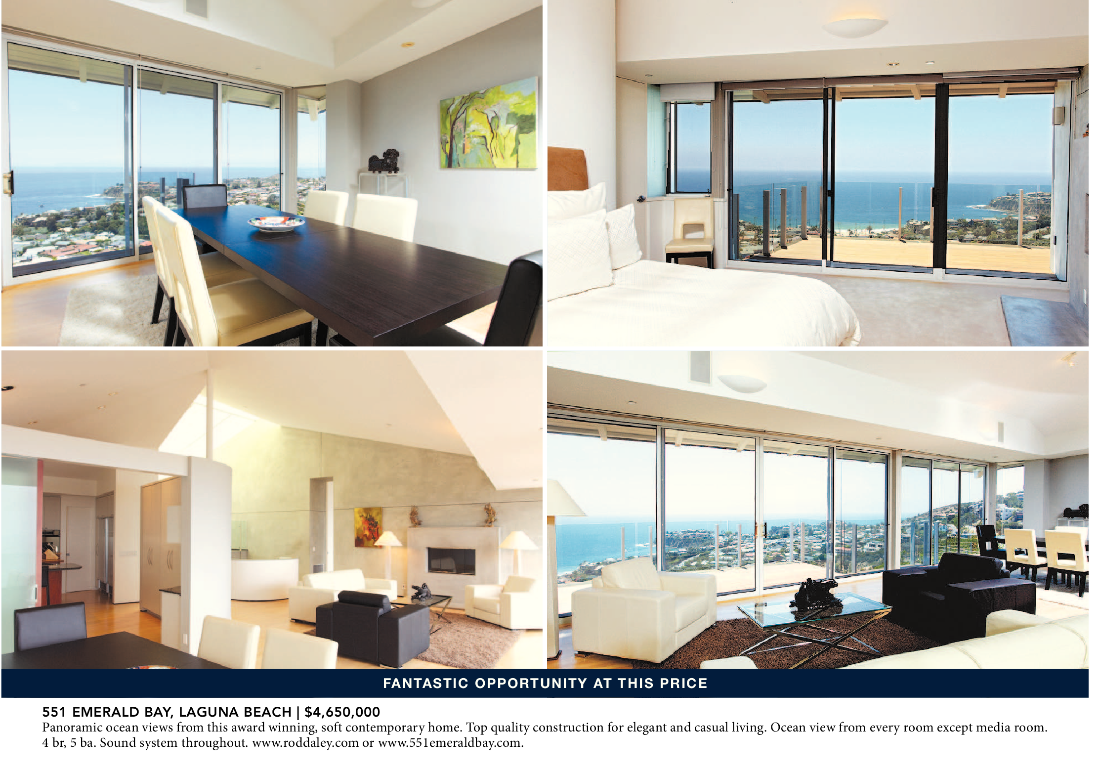 551 EMERALD BAY, LAGUNA BEACH | $4,650,000 Panoramic ocean views from this award winning, soft contemporary home. Top quality construction for elegant and casual living. Ocean view from every room except media room. 4 br, 5 ba. Sound system throughout. www.roddaley.com or www.551emeraldbay.com.