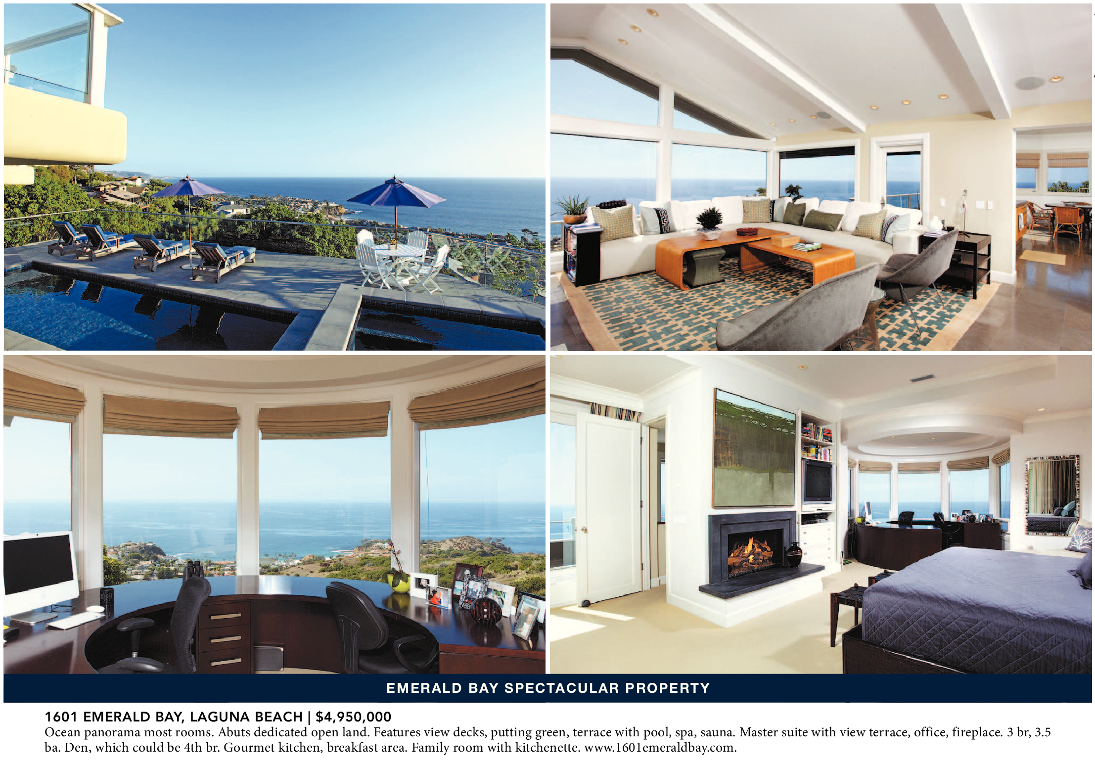 EMERALD BAY SPECTACULAR PROPERTY 1601 EMERALD BAY, LAGUNA BEACH | $4,950,000 Ocean panorama most rooms. Abuts dedicated open land. Features view decks, putting green, terrace with pool, spa, sauna. Master suite with view terrace, office, fireplace. 3 br, 3.5 ba. Den, which could be 4th br. Gourmet kitchen, breakfast area. Family room with kitchenette. www.1601emeraldbay.com.