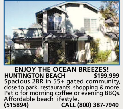 HUNTINGTON BEACH $199,999 Spacious 2BR in 55+ gated community, close to park, restaurants, shopping & more.