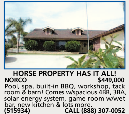 NORCO $449,000 Pool, spa, built-in BBQ, workshop, tack room & barn! Comes w/spacious 4BR, 3BA, solar energy system, game room w/wet bar, new kitchen & lots more.