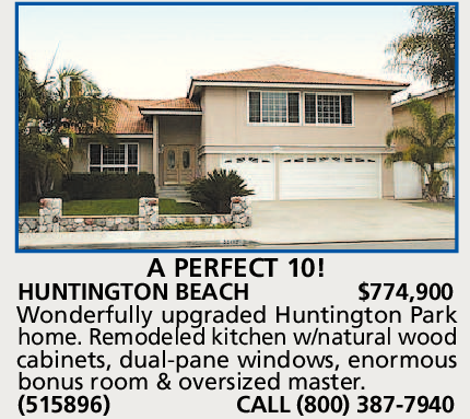 HUNTINGTON BEACH $774,900 Wonderfully upgraded Huntington Park home. Remodeled kitchen w/natural wood cabinets, dual-pane windows, enormous bonus room & oversized master. (515896) CALL (800) 387-7940