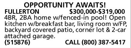 FULLERTON $300,000-$319,000 4BR, 2BA home w/fenced-in pool! Open kitchen w/breakfast bar, living room w/FP, backyard covered patio, corner lot & 2-car attached garage. (515876) CALL (800) 387-5417