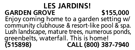 GARDEN GROVE $155,000 Enjoy coming home to a garden setting w/ community clubhouse & resort-like pool & spa. Lush landscape, mature trees, numerous ponds, greenbelts, waterfall. This is home! (515898) CALL (800) 387-7940