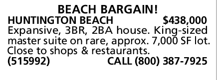 HUNTINGTON BEACH $438,000 Expansive, 3BR, 2BA house. King-sized master suite on rare, approx. 7,000 SF lot. Close to shops & restaurants. (515992) CALL (800) 387-7925