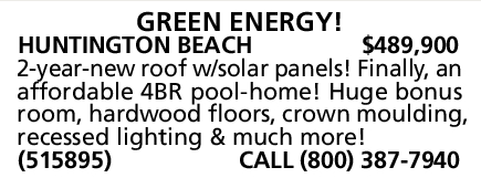 HUNTINGTON BEACH $489,900 2-year-new roof w/solar panels! Finally, an affordable 4BR pool-home! Huge bonus room, hardwood floors, crown moulding, recessed lighting & much more! (515895) CALL (800) 387-7940