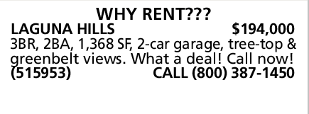 LAGUNA HILLS $194,000 3BR, 2BA, 1,368 SF, 2-car garage, tree-top & greenbelt views. What a deal! Call now! (515953) CALL (800) 387-1450