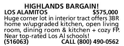 LOS ALAMITOS $575,000 Huge corner lot in interior tract offers 3BR home w/upgraded kitchen, open living room, dining room & kitchen + cozy FP.