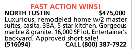 NORTH TUSTIN $475,000 Luxurious, remodeled home w/2 master suites, casita, 3BA, 5-star kitchen. Gorgeous marble & granite. 16,000 SF lot. Entertainer’s backyard. Approved short sale! (516094) CALL (800) 387-7922