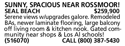 SUNNY, SPACIOUS NEAR ROSSMOOR! SEAL BEACH $259,900 Serene views w/upgrades galore. Remodeled BAs, newer laminate flooring, large balcony off living room & kitchen nook. Gated community near shops & Los Al schools!